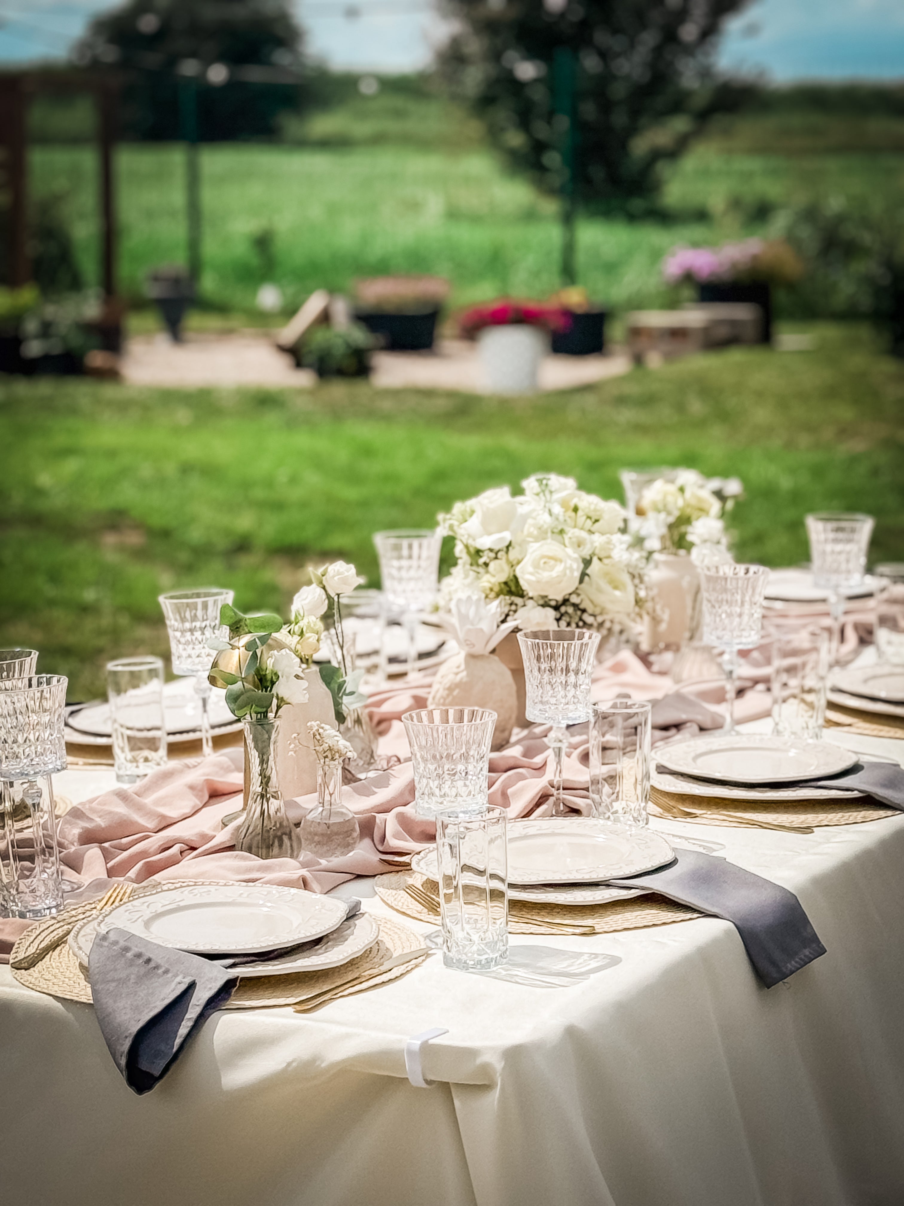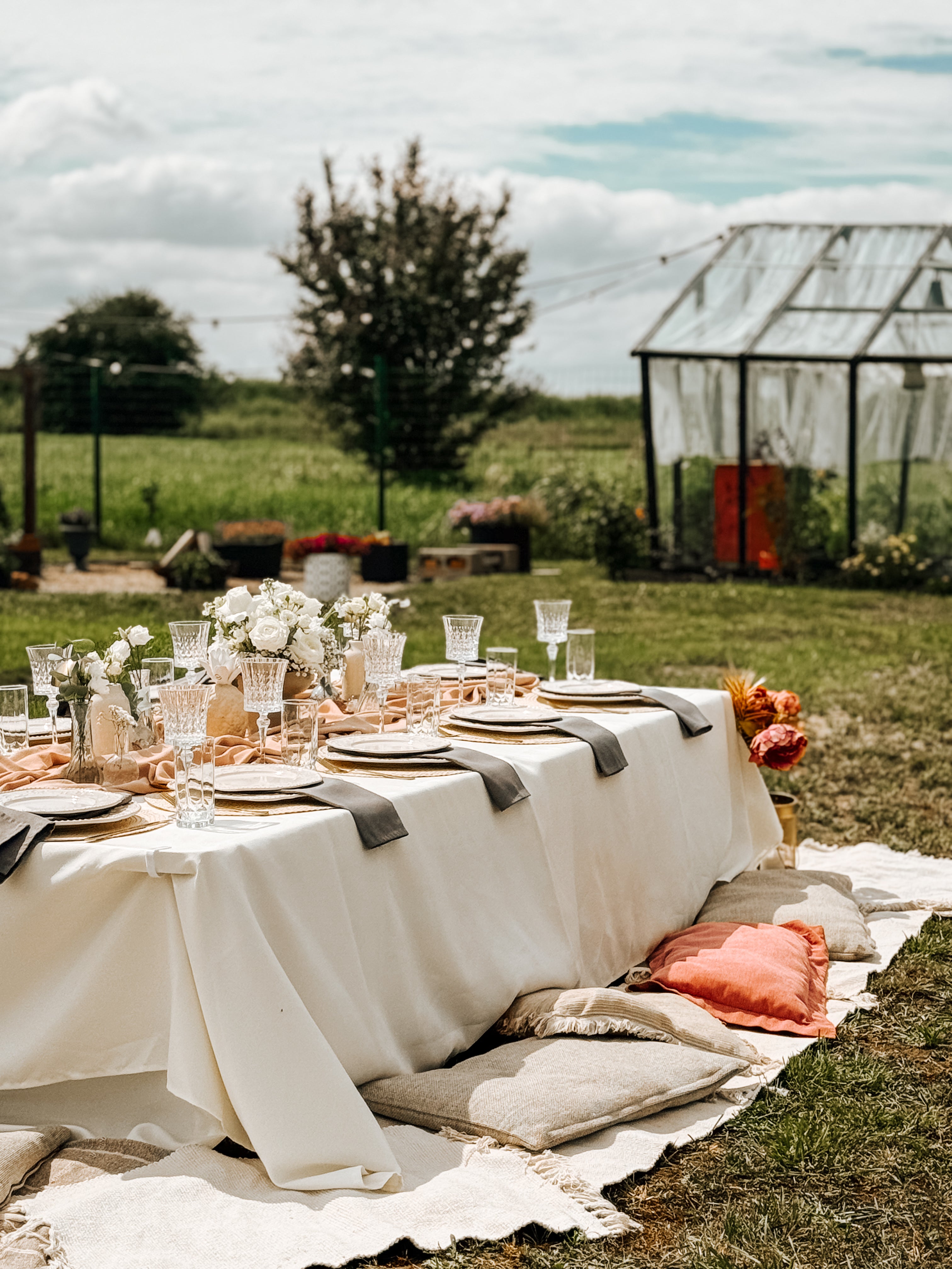 A beautifully set table or low picnic table in the style of your choice.