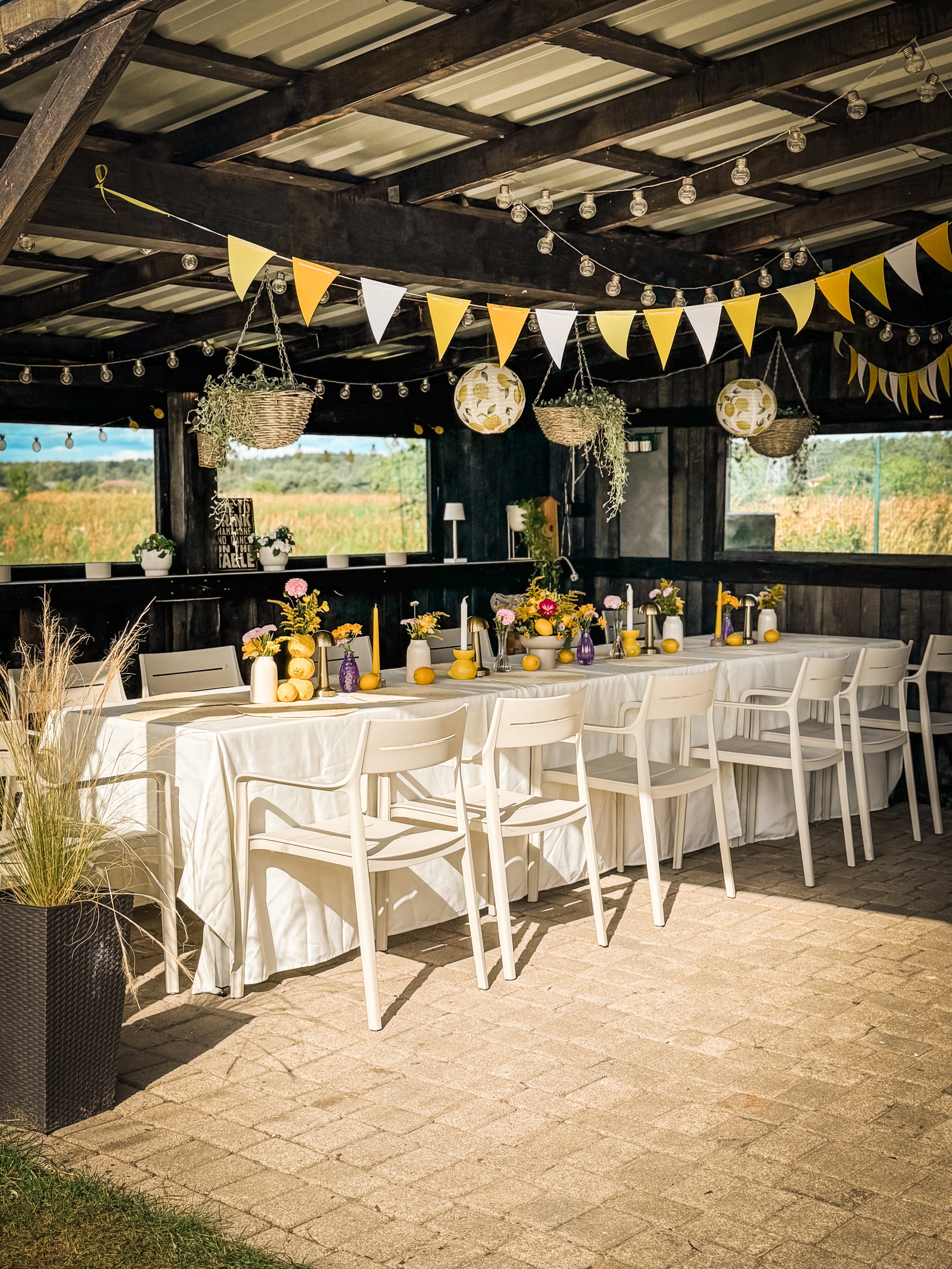 35m2 terrace, which will protect from rain and sun. The terrace has tables, chairs and lamps for the evening hours. Up to 20 people.