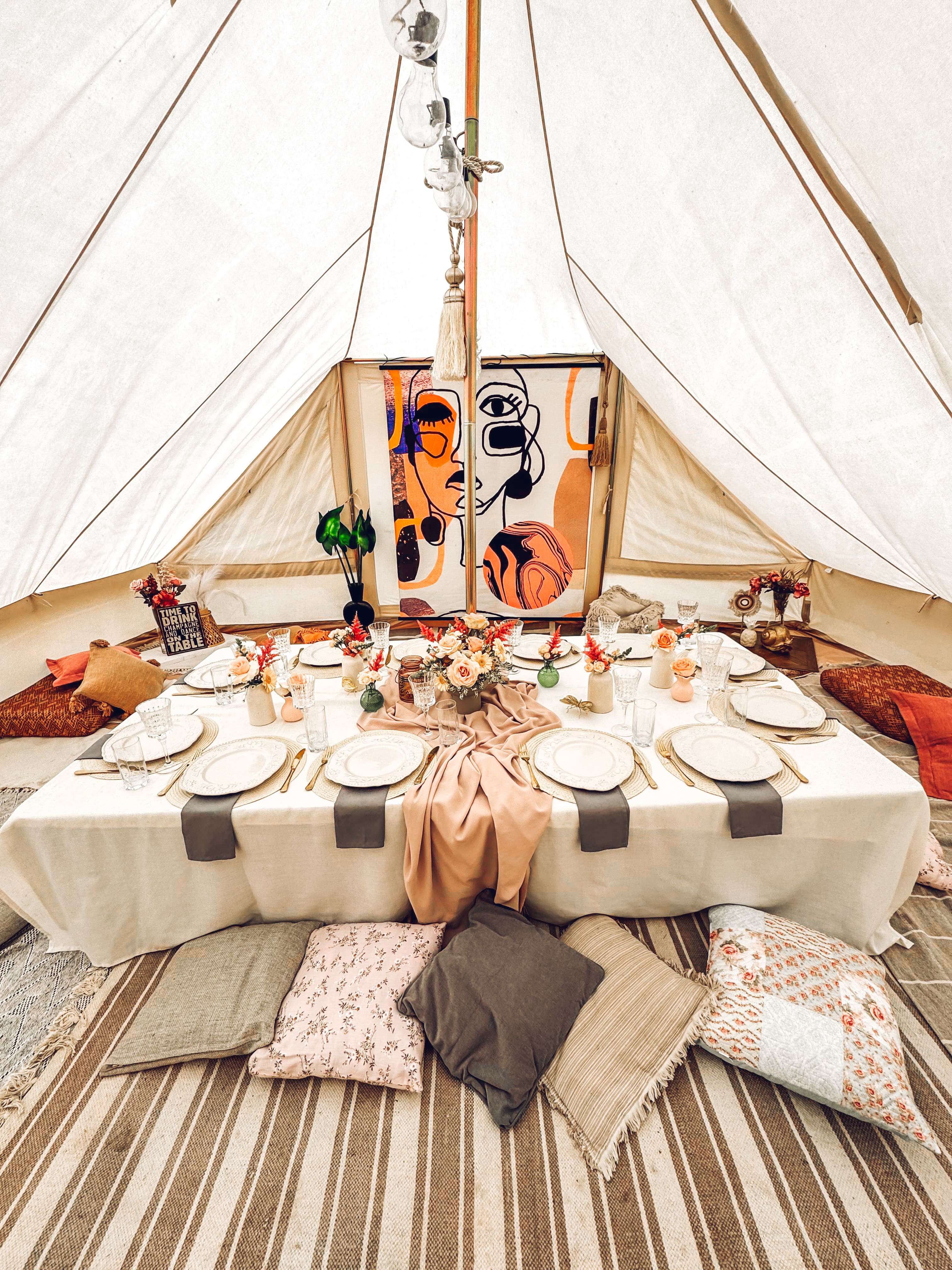Well-equipped glamping tent for a special atmosphere and shelter from the rain. Up to 12 people.
